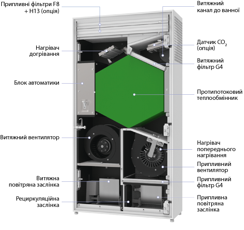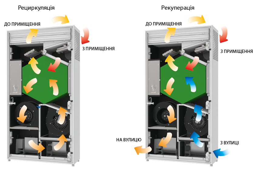 Заслінки припливного та витяжного повітря закриваються під час увімкнення функції очищення повітря, а рециркуляційна заслінка відкривається. Повітря з кімнати циркулює через фільтри та повертається назад до кімнати очищеним.
