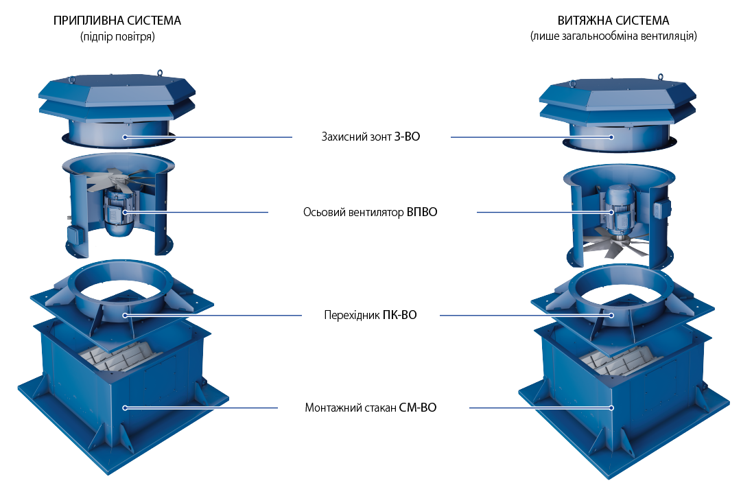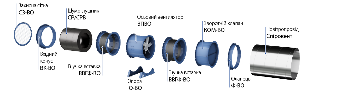 Вентилятор встановлюється на будь-яку рівну поверхню або безпосередньо у вентиляційний канал. Можливе встановлення вентилятора у горизонтальному або вертикальному положенні. Під час монтажу вентилятора у повітряному каналі з'єднання з повітропроводами здійснюється за допомогою фланців. Для підлогового, настінного або стельового монтажу вентилятора застосовуються опори О-ВО (не входять до комплекту постачання, замовляються окремо). Можуть встановлюватися на дахах будівель для забезпечення прямого подавання зовнішнього повітря у сходові зони.