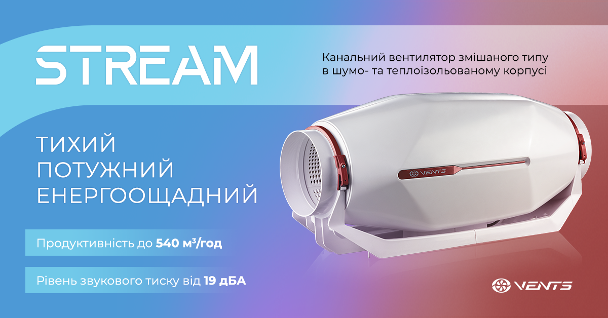 Канальні вентилятори змішаного типу Stream використовуються у припливно-витяжних системах вентиляції. Це тихі, потужні, енергоощадні пристрої, що поєднують розширені можливості та технологічність осьових і відцентрових моделей. Попри потужний повітряний потік та високу продуктивність, які здатні забезпечити ці вентилятори, їхня конструкція сприяє низькому рівню шуму (28 дБА на 3 швидкості).
